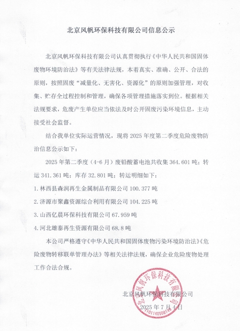 北京風帆環(huán)??萍加邢薰?025年第二季度危險廢物防治信息公示